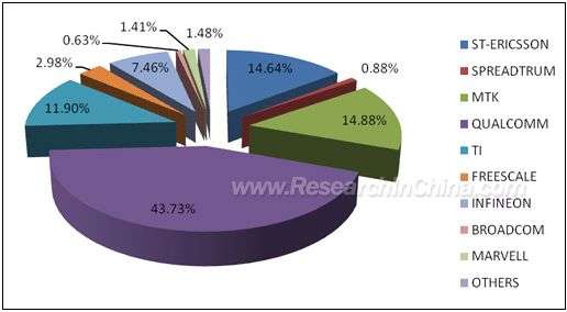 据 Research In China 的数据,英飞凌是 2009 年世界第五大手机基带芯片厂商,前四位分别是高通、意法-爱立信、联发科、德州仪器(TI)。