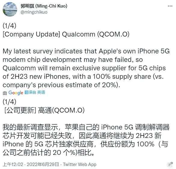 被誉为地表最强苹果分析师的郭明錤,今日凌晨发推表示,苹果的自研 iPhone 5G 基带 Modem 芯片似乎遭遇了失败。