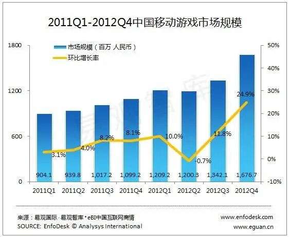 根据EnfoDesk发布的《2012年第4季度中国移动游戏市场季度监测》数据显示,2012年第4季度中国移动游戏市场规模达到16.77亿元,环比增长24.9%。且移动游戏的市场规模继续放大,达到7.47亿元,环比增长41.2%。
