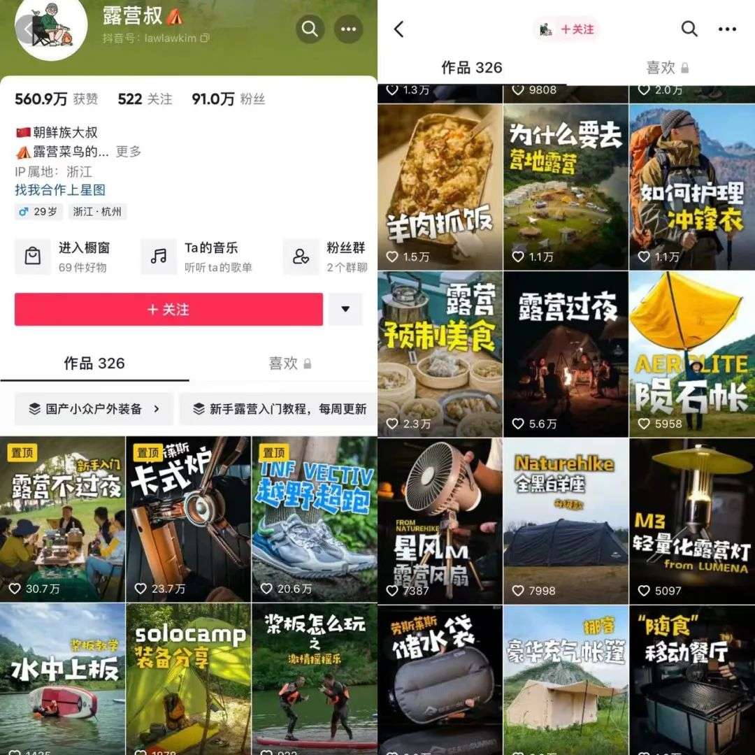所以你就可以做露营的好物测评号、开箱号,测评的场景可以是固定的,也可以是在户外。