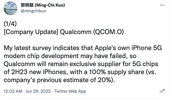 然而郭明錤今天的推特,却是彻底打破了之前的传言,即使到 2023 年,苹果 iPhone 也只会用高通的骁龙基带,自研基带什么的,已经没希望了。