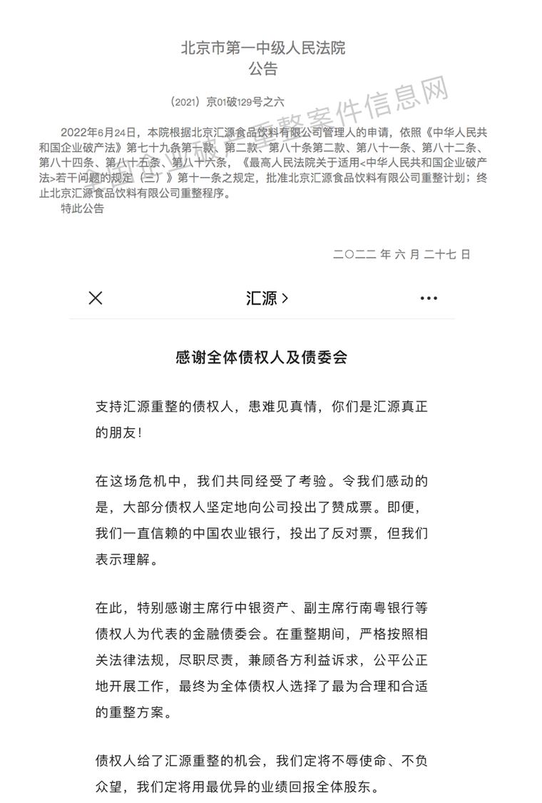 图片来源:全国企业破产重整案件信息网/汇源公众号截图