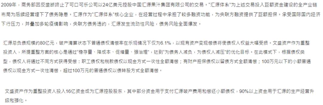 对于汇源的债务缘起,文盛资产在官网中写道,2009年,商务部因反垄断终止了可口可乐公司以24亿美元控股汇源集团的交易。“汇源体系”为上述交易投入巨额资金建设的全产业链布局为后续经营埋下了债务隐患。北京汇源作为“汇源体系”核心企业,在经营过程中承担了较多融资功能,为关联方融资提供了巨额担保。承受国际国内经济下行压力,并叠加多轮疫情影响,关联方债务违约,北京汇源发生流动性风险,债务风险全面爆发。
