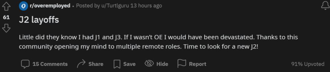 还有不少人在 reddit 社区晒出了自己 Overemployed 期间被裁员的经历,这些人并没有被雇主发现自己从事多份工作,但还是因为公司大客户流失等原因被裁了。此时,他们不得不感叹,还好有另一份工作托底。