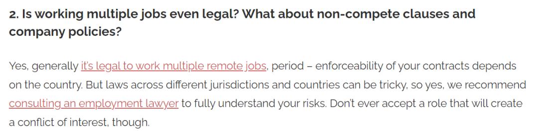 在网站的问答版块,Isaac P. 列出了一些问答来帮助人们跨越身兼多职的门槛,常见问题包括:「做多份工作违法吗?有竞业协议怎么办?」「第二份工作是找大公司还是小公司?」「我可以在另一个国家找第二份工作吗?」「公司可否在未经我同意的情况下合法查询我的受雇情况?」可见,这种工作方式还是存在一些法律风险的。