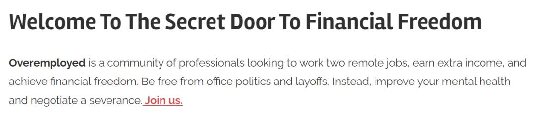 这些人聚集在一个名叫「Overemployed」的网站,网站的首页写道:「『Overemployed』指的是一群希望做两份远程工作、赚取额外收入并实现财务自由的专业人士。远离办公室政治和裁员,改善你的心理健康,做好离职补偿金协商。」