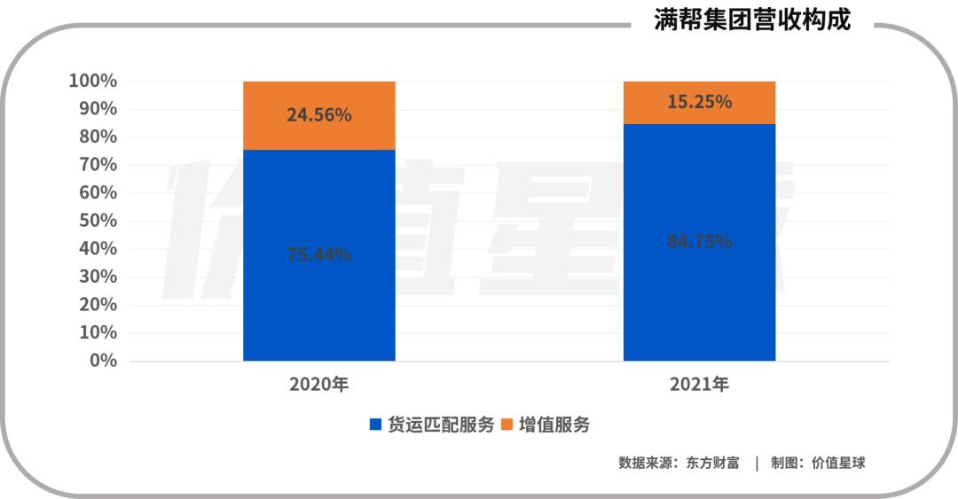 据财报数据显示,满帮集团营收主要来自于货运匹配服务和增值服务两部分,其中2020年、2021年货运匹配业务分别实现营收19.47亿元、39.469亿元,分别占总营收的75.44%、84.75%。