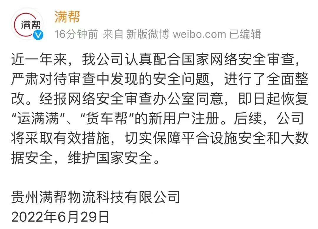 昨日,据微博@满帮发布,近一年来,公司认真配合国家网络安全审查,严肃对待审查中发现的安全问题,进行了全面整改。经报网络安全审查办公室同意,即日起恢复“运满满”“货车帮”的新用户注册。后续,公司将采取有效措施,切实保障平合设施安全和大数据安全,维护国家安全。