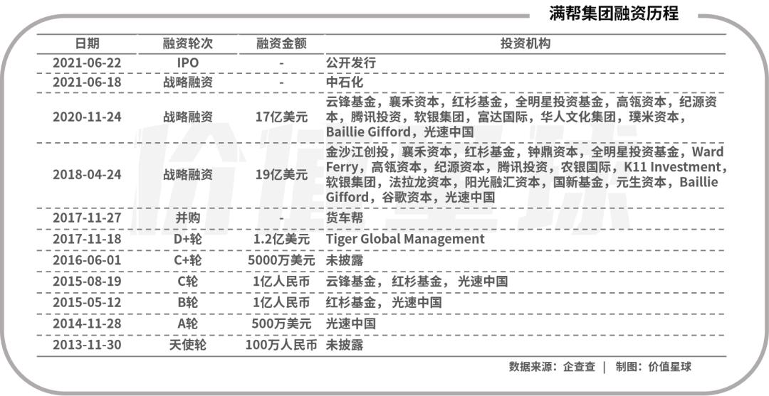 2020年,满帮宣布获得新一轮17亿美元融资,投资方又引入阿里系、腾讯系资本,以及富达、高瓴、红杉等国内外明星机构。