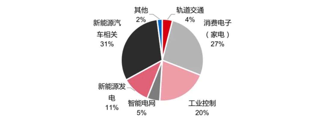 从下游需求看,新能源汽车(含充电桩)、变频家电、工业控制及新能源发电是IGBT主要的应用领域,占比分别达 31%、27%、20%、11%。