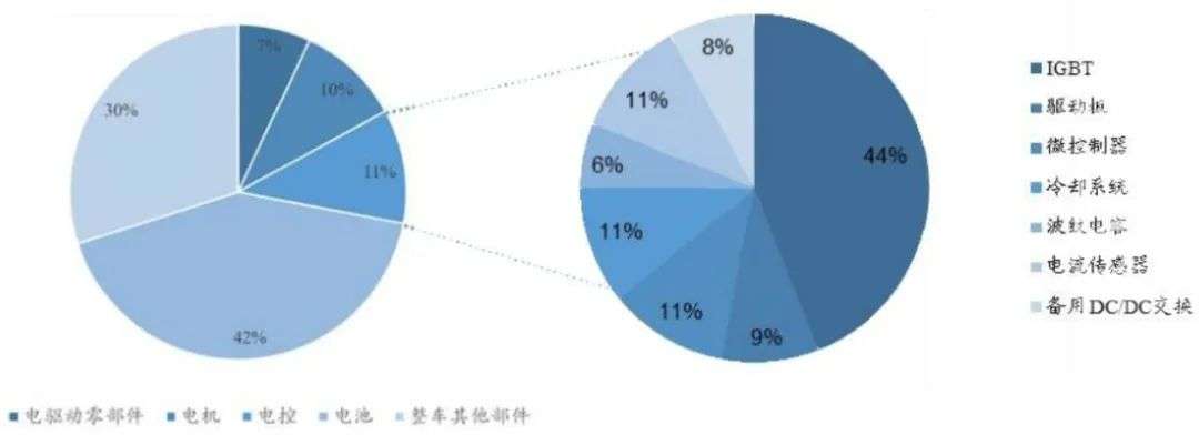 在新能源汽车成本结构中,11%为电控系统,而电控系统中有44%为IGBT的成本。因此推算IGBT的市场规模占到了整个电动汽车市场规模的4.84%。