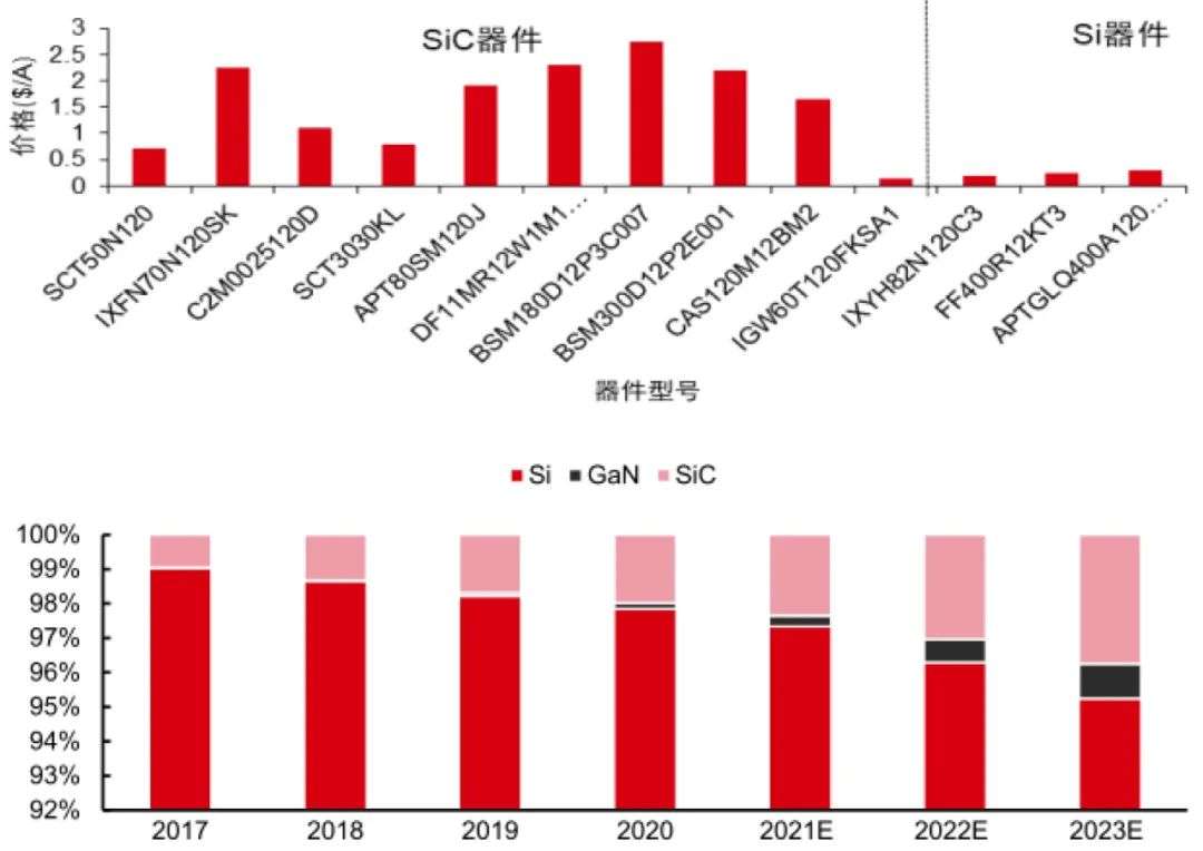 目前IGBT市场出现了以Si基器件为主导,SiC和GaN为"游击"形式存在的局面。其中,SiC被业内认为是未来的重要发展方向,有望引领性能全面提升。但受限于高成本的制约,SiC功率器件(如SiC-Mosfet)短期内还无法叫板Si-IGBT,在逐步渗透的过程中将会与其长期共存。