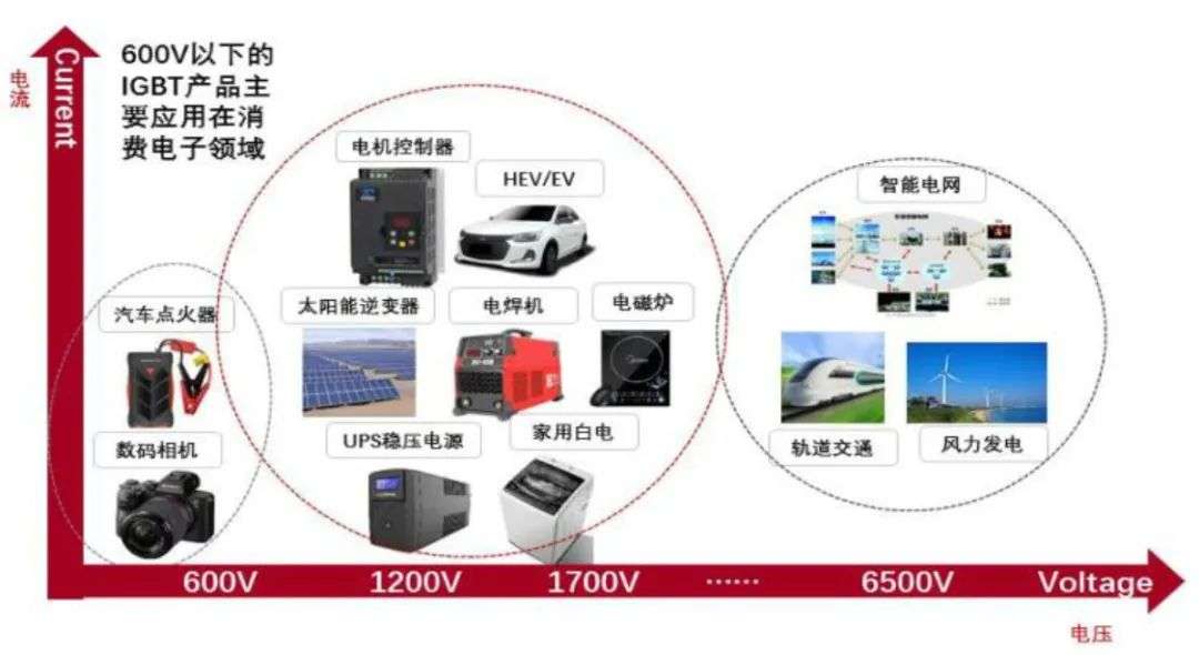 IGBT可应用于650~6500V电压范围的各类应用场景,按照应用场景的电压等级分类,包括三个主要电压等级:低电压范围IGBT(600V以下),应用于多种3C产品;中电压范围IGBT中压(600V~1200V),应用在新能源汽车、光伏、工控等;高电压范围IGBT(1700V以上),应用于智能电网、高铁轨道交通、风力/光伏发电等。