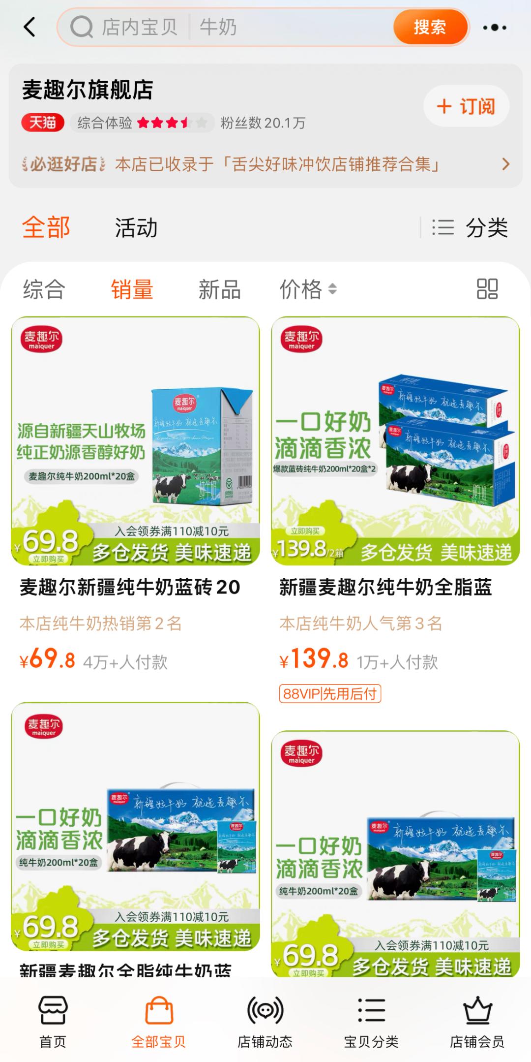 《天下网商》曾在某主播直播间发现,麦趣尔两箱纯牛奶价格99.6元,每盒200ml,算下来属于“轻奢”级别的牛奶,目前天猫上“麦趣尔纯牛奶蓝砖20盒整箱”这一单品月销超5万。