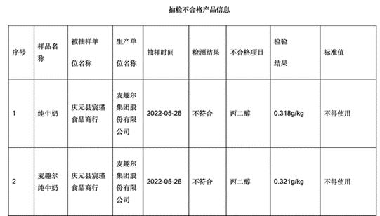事情的起因是浙江省庆元县市场监管局公示2022年第4期食品抽检检验情况,结果检出标称麦趣尔集团股份有限公司生产的2批次纯牛奶不合格,抽样时间为5月26日,分别为麦趣尔的“纯牛奶”“麦趣尔纯牛奶”两款奶,不合格项目为丙二醇,该项目的要求为“不得检出”。