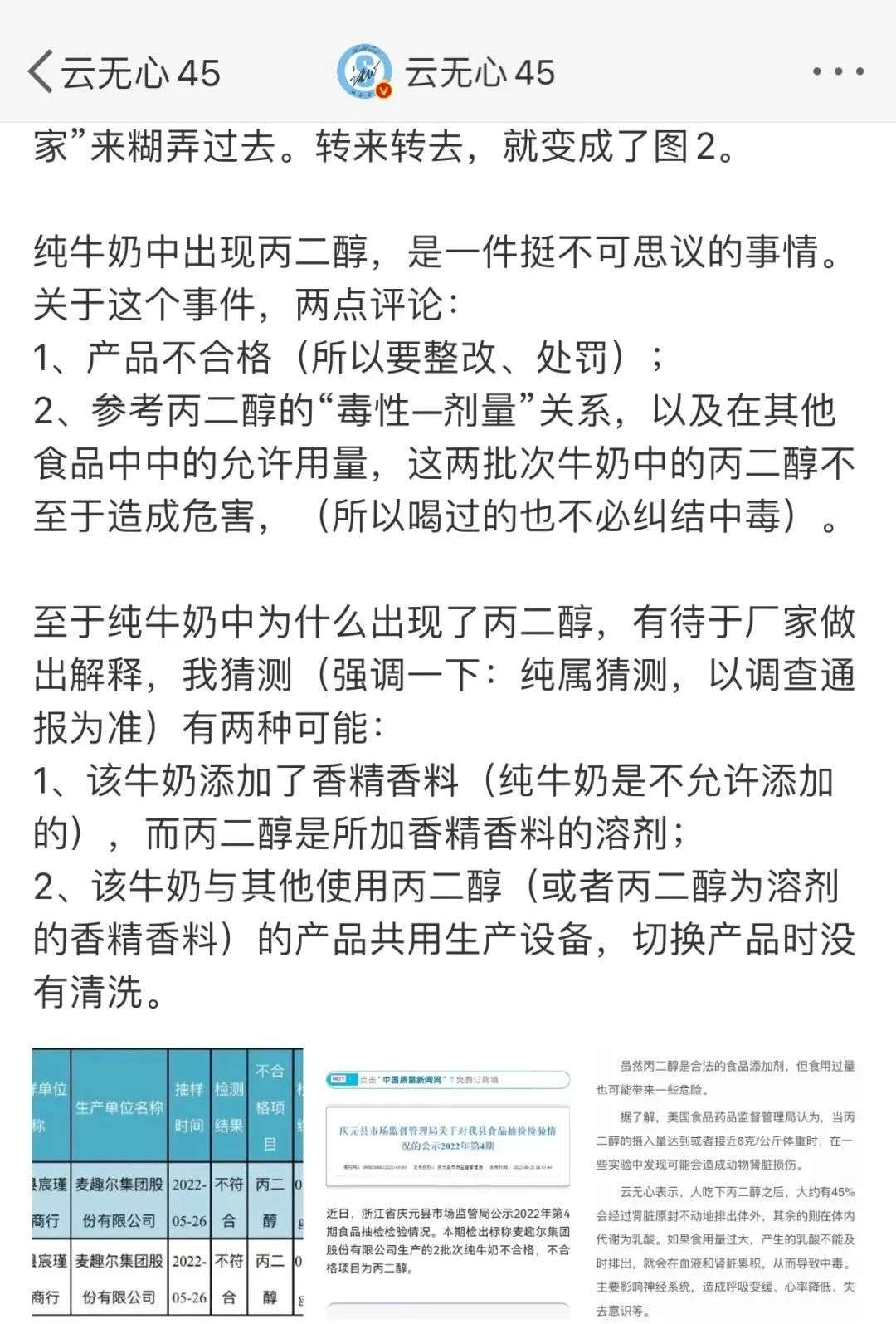 热度的缘由来自前一天。6月29日,中国质量新闻网报道称,上市乳企麦趣尔生产的2批次纯牛奶不合格,不合格项目为丙二醇。该消息引发网络热议,有网友称:“刚喝完两箱,心态崩了。”