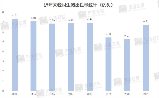 数据显示,2021年全年生猪出栏量6.71亿头,近年来除了2019、2020年的出栏量低潮期,全国消费量基本维持在6.7-7.4亿头水平。