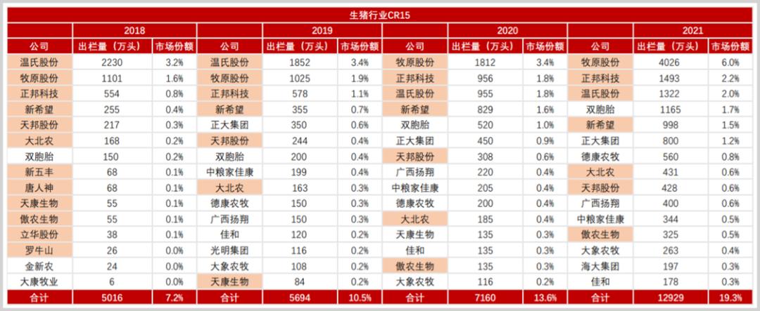 如果保持2021年全国出栏量水平不变,按照牧原1亿头,另外3家平均每家6000万计算,仅这4家养殖企业出栏规模就占到全国的51.27%。而据中信期货统计,2021年前CR4市占率仅为11.9%!