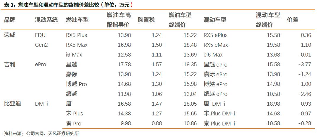 天风证券在去年下半年对比了荣威、吉利、比亚迪旗下的多款混动车和燃油车,发现在终端价差上,多款混动车型的价格已经低于同级别燃油车。