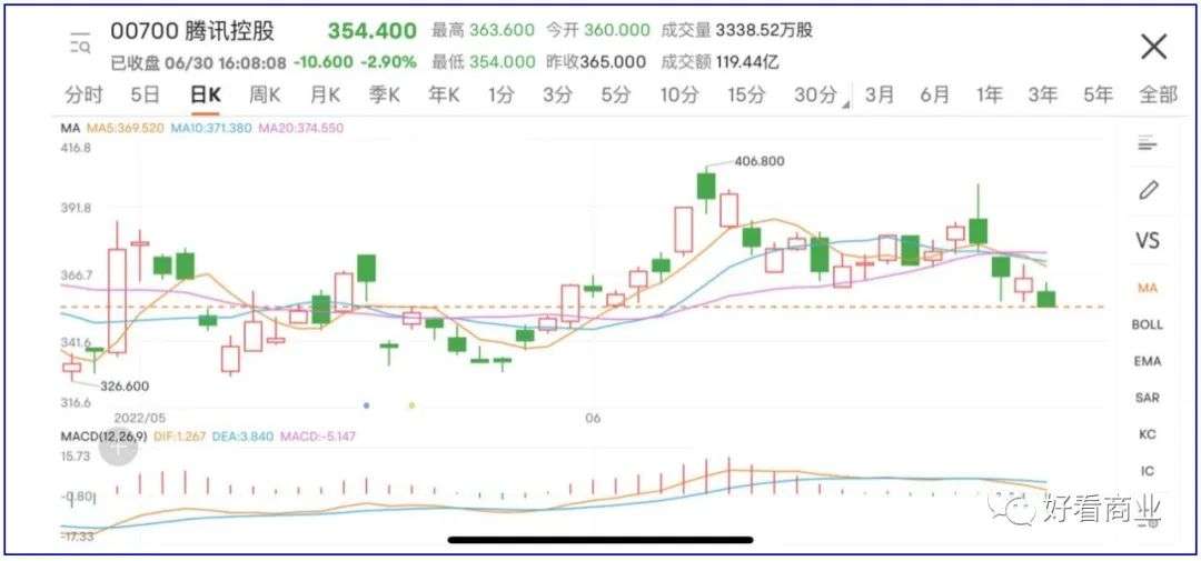 6月28日-30日,腾讯股价继续低开低走。截至6月30日收盘,腾讯市值已较Naspers公告前的高点蒸发超4400亿港元。