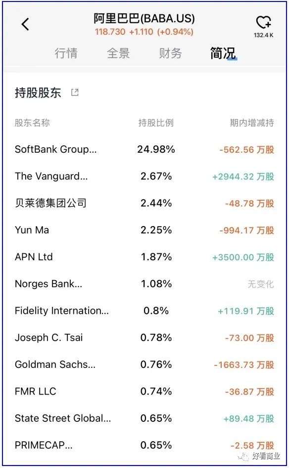 据标普的数据,目前软银在阿里巴巴持股24.98%,仍为第一大股东。
