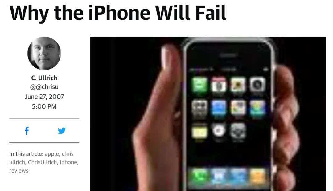 包括微软 CEO、RIM CEO、彭博社、商业周刊等等均认为 iPhone 根本赢不了,在黑莓、诺基亚、摩托罗拉面前,就是蚍蜉撼大树。