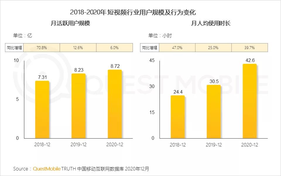 QuestMobile数据显示,截至2020年12月,国内短视频用户规模同比增6%至8.72亿,月人均使用时长为同比增39.7%至42.6小时。而 长 视频平台,则出现了下滑的趋势。数据显示,2020年9月,在线视频全行业月活已经从去年的9.26亿下降到8.45亿,渗透率 都 同比下滑8.4%。