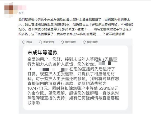 6月28日,有多位虚拟主播就被曝出榜一大哥为未成年人,他在拿到舰长礼物后便申请退款,退款金额在5万到14万不等。