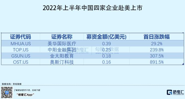 由于目前超过半数的中概股已被美国SEC列入“预摘牌名单”或“确定摘牌名单”,中国企业赴美上市的数量短期内或将持续维持疲软,今年以来仅有4家,数量同比下滑9成,融资额合计约0.98亿美元,同比下滑99%。其中奥斯汀光电科技首日涨幅近900%,拿下美股IPO上市首日涨幅冠军席位。