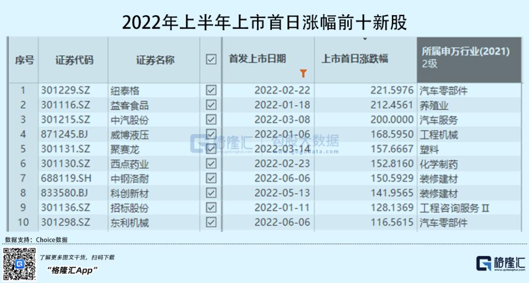 个股上市首日涨幅方面,创业板纽泰格以221%位居榜首,益客食品、中汽股份紧随其后,涨幅分别为212%、200%,前十涨幅均超过100%,其中7家创业板,2家北交所,1家科创板。值得一提的是,有3家属于汽车股,这与今年汽车板块的景气度提升不无关系。