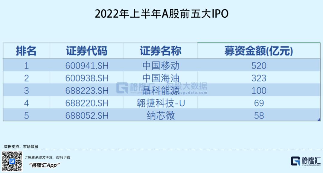融资总额大幅增加主要得益于中国移动、中国海油两个巨无霸的贡献,其分别为募资519.8亿元、322.9亿元,前5大IPO共计融资规模为1070亿元,同比增长152%,其中,中国移动、中国海油、晶科能源募资额均排在全球前十。