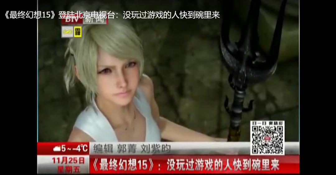 游戏发售前4天,北京电视台(BTV)播了一段专题新闻宣传《最终幻想15》,内容包括总监采访、角色展示等,屏幕下方的标题栏还写着“没玩过游戏的人快到碗里来”,得到综合性官方电视媒体的大力宣传,在游戏领域并不常见。