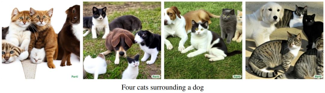 像所有其他文本到图像生成器一样,Parti 以各种类似的方式处理存在的各种问题,例如不正确的对象计数、混合特征、不正确的关系定位或大小、不正确处理否定,列表可能会继续等。以下是 Parti 进行处理的一些例子: