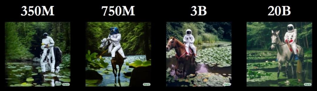 研究人员创建了四种不同规模的 Parti 模型,其中包括 3.5 亿、7.5 亿、30 亿和 200 亿的参数计数。这些模型是使用 Google Cloud TPU 进行训练的,这些 TPU 能够轻松支持创建这些巨大的模型。网站上提供一些不同模型规模间的比较,但在这里仅分享一些从论文中摘取的比较(从左到右从小到大):