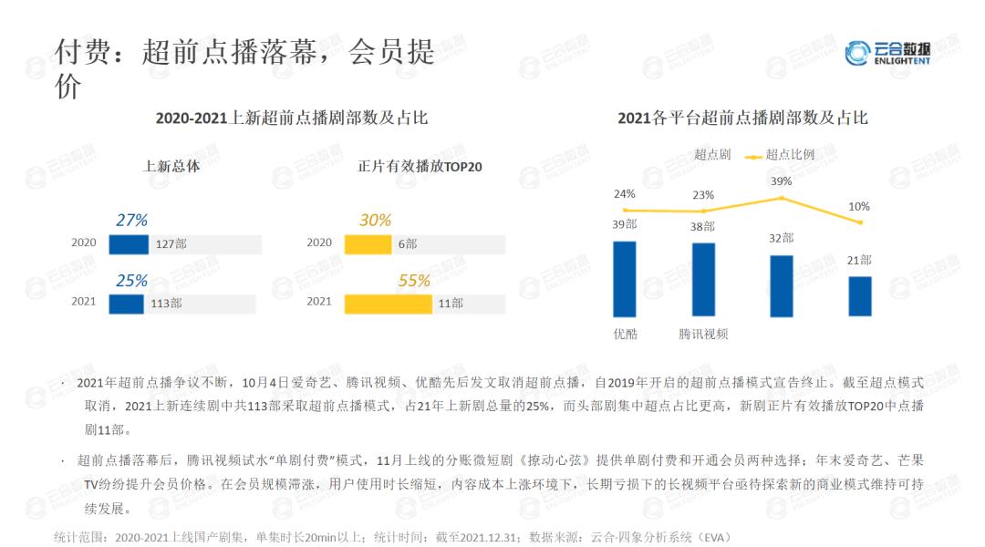 或许是在点播模式中看到了爆款的吸金实力,此后,腾讯视频在《庆余年》、《扫黑风暴》等热播剧中均采用了“超前点播”模式,“优爱芒”等各大长视频平台纷纷效仿,由云合数据发布的《2021年连续剧市场网播表现及用户分析》报告显示,在过去一年里有113部连续剧采取超前点播模式,占总上新剧的25%。