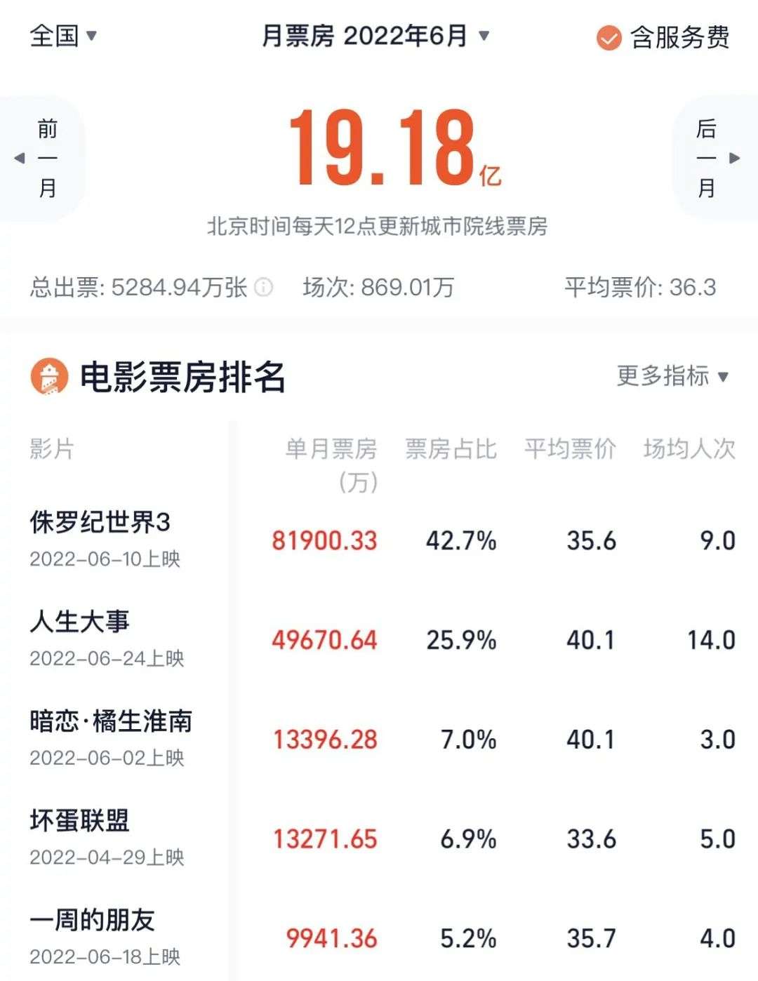 6月已经上映的影片中,国产片表现最好的是6月下旬上映的《人生大事》,单月票房达到了4.97亿(含服务费),虽然不敌月票房冠军《侏罗纪世界3》超8亿的强势表现,但已经是历史上6月票房最高的国产片了。