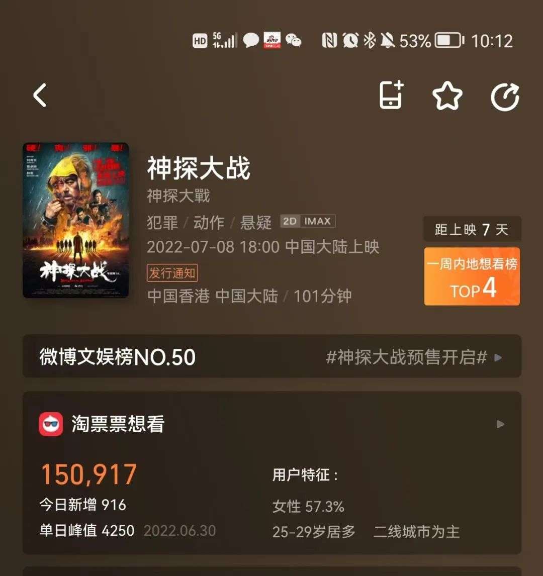 已经有影片准备好战斗了。灯塔专业版显示,定档于7月8日的新片《神探大战》已经有超15万的想看人数,犯罪、动作类型有它固定的受众群体,票房也会比较稳定;备受期待的陈思诚新片《外太空的莫扎特》,目前也有超14万的想看人数,作为一部奇幻喜剧片,受众群体相对较大,有冲击高票房的机会。