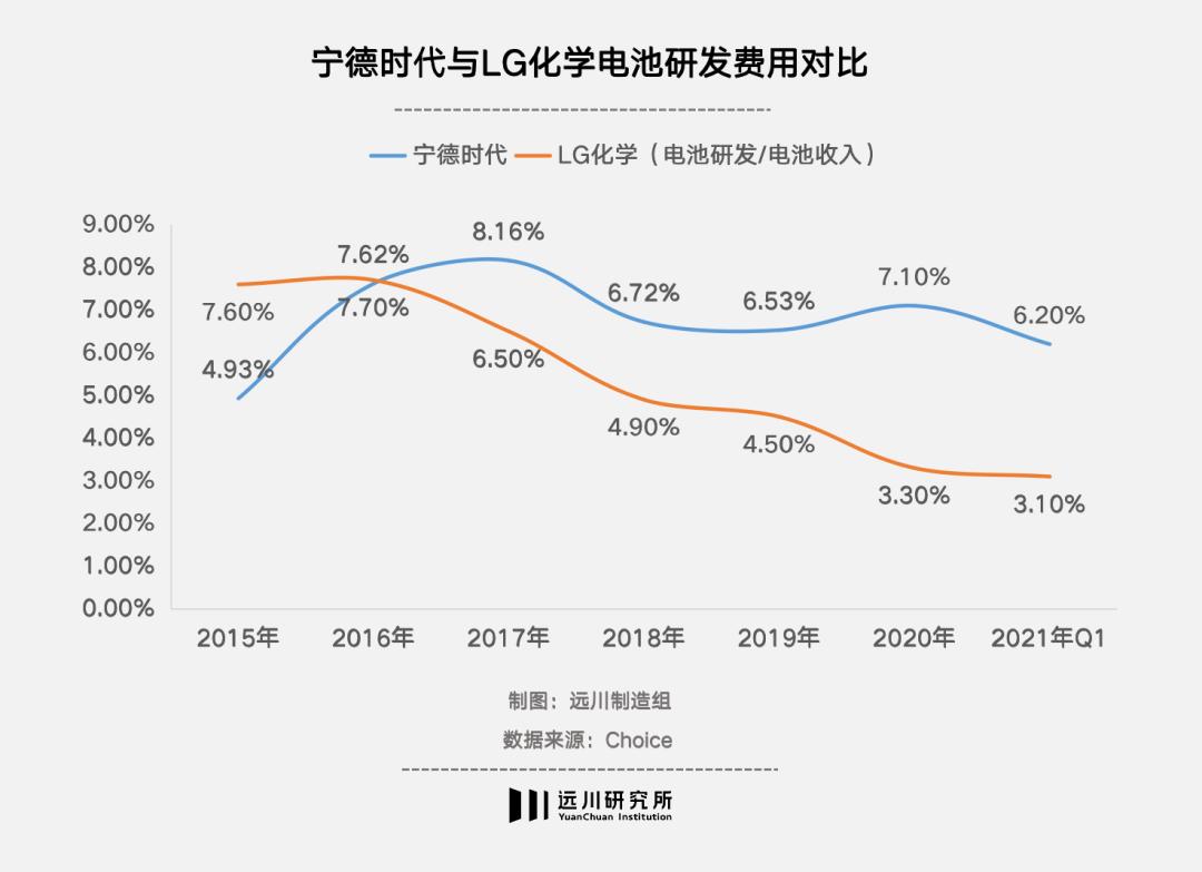 2015-2021年Q1宁德时代与LG化学研发费用占营收比例情况