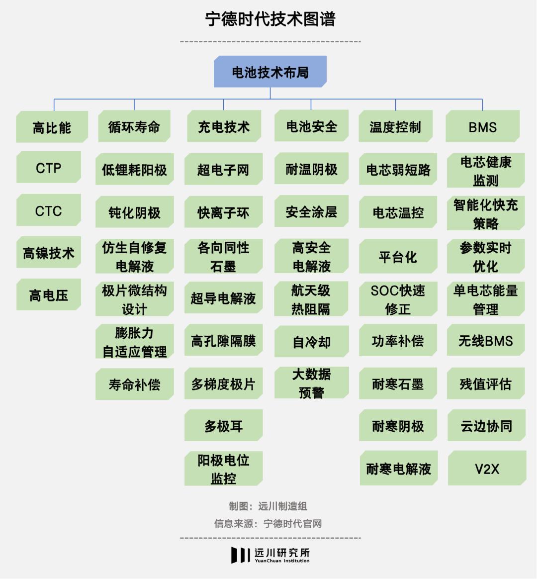 每年数十亿的研发费用与万人规模的研发团队,撑起了宁德时代的技术布局,其技术图谱包含了高比能、循环寿命、充电技术、电池安全、温度控制与BMS等诸多方面。