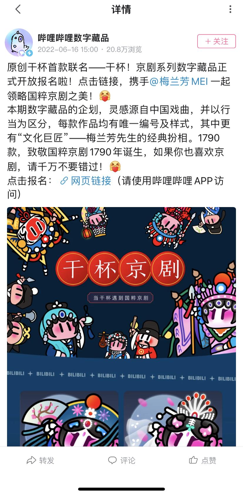 当前,B站尚未公布下一款数字藏品推出时间,最新的一款数字藏品是首次同传统文化结合的“干杯!京剧”系列,合作方为梅兰芳文化科技,于6月16日开放预约报名,以二次元风格的二创设计为亮点,灵感源于中国戏曲角色,售价为299元。
