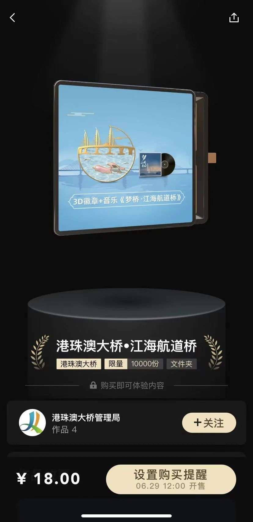 目前,“鲸探”上的数字藏品以文化艺术、历史文物为主,不少藏品价格亲民,首页显示的藏品多在20元左右。最新一款数字藏品为6月29日12点开售的“港珠澳大桥•江海航道桥”“港珠澳大桥•西人工岛”两个系列藏品,合作发行方为港珠澳大桥管理局,售价统一为18元。