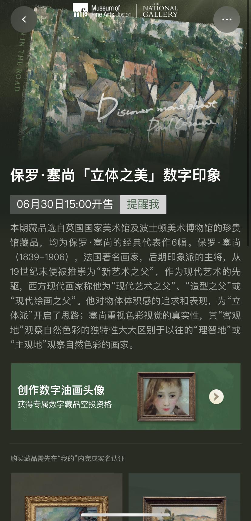 目前,“幻核”上的数字藏品以历史文化、文旅艺术等题材为主,最新一款藏品为6月30日开售的,同英国国家美术馆、波士顿美术博物馆联合发布的“保罗•塞尚‘立体之美’数字印象”,选取了保罗•塞尚6幅经典代表作,售价188元。