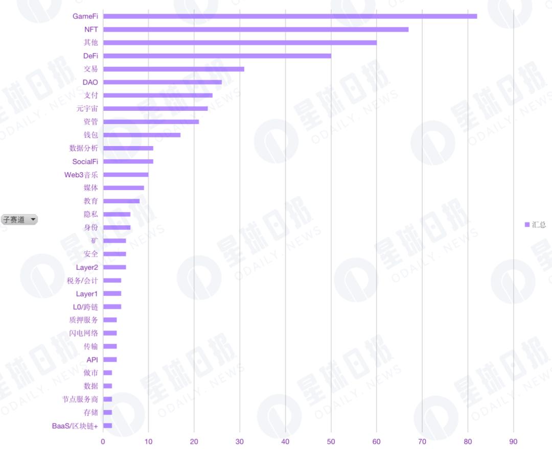 此外,其他子赛道的融资消息也很活跃,共有 60 笔,位列第三。在这一大类中包含了孵化、咨询、营销、技术开发平台、链上监测、碳信用、积分奖励等领域。从中也能看出一个积极、明显的特征:投资机构正在积极拓展新方向,不断扩大 Web3 的使用场景和与终端用户的对话机会。