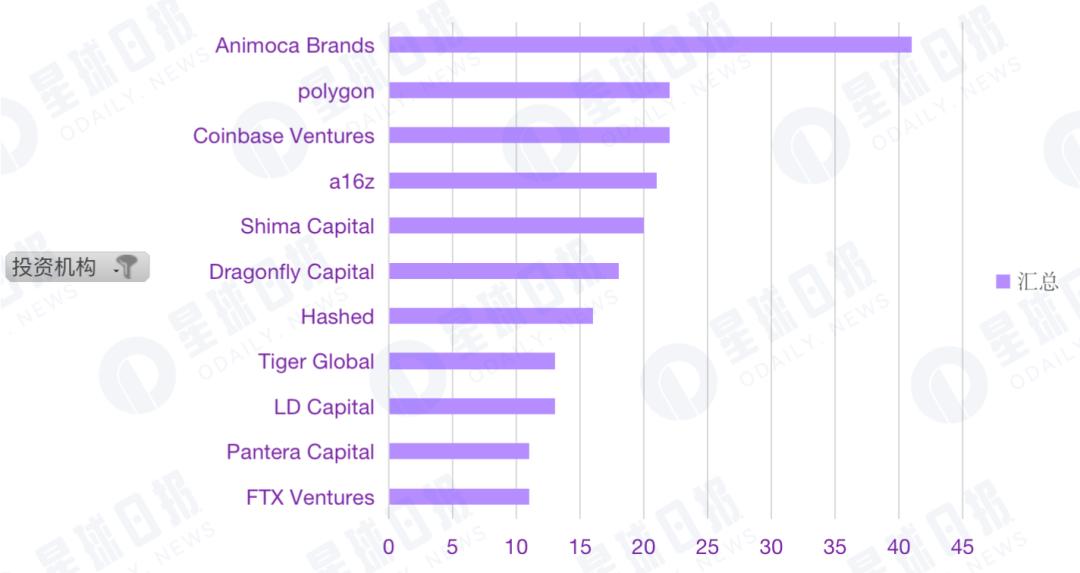 Animoca Brands 参与投资 41 笔,是投资项目最多的一个机构;