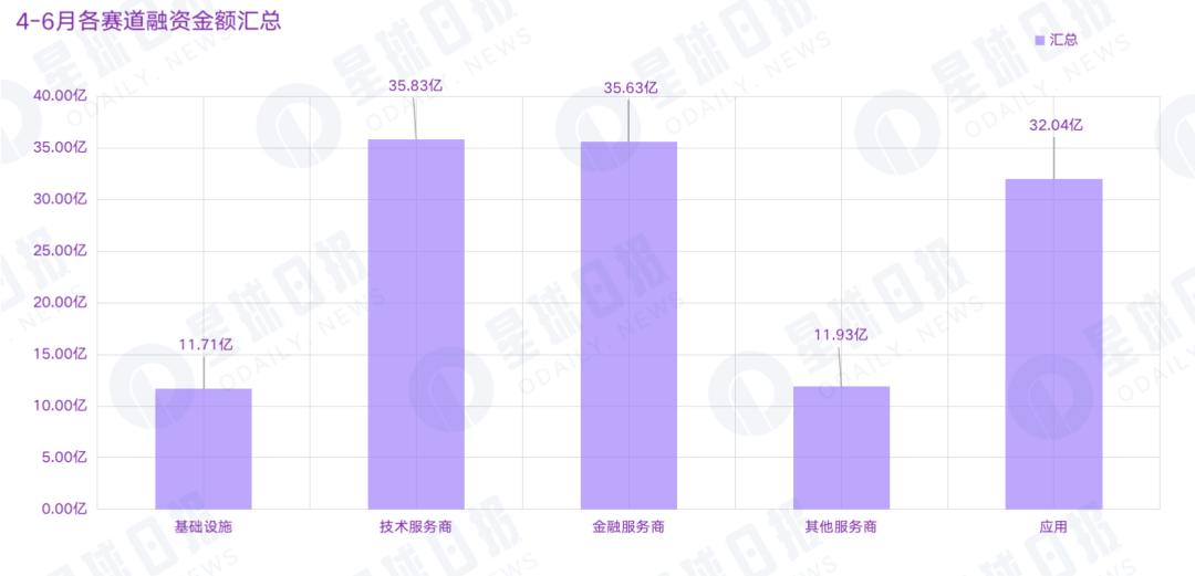 据 Odaily星球日报不完全统计,2022 年 4 月至 6 月全球加密市场共发生 511 起投融资事件(不含基金募资及并购),已披露总金额为 127.1 亿美元,集中在基础设施、技术服务商、金融服务商、应用和其他服务商赛道,其中技术服务商赛道获得的融资金额最多,为 35.83 亿美元。