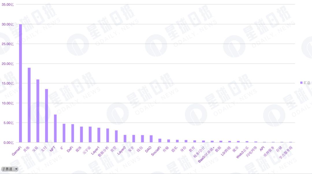 从子赛道的融资额来看,GameFi 融资金额遥遥领先,高达 29.96 亿美元,占全行业融资总额的 23.5%。交易和支付领域也有不俗的表现,分别以 16 亿美元和 13.53 亿美元位居第三和第四,而链上存储、数据以及链改等技术服务关注度较低。