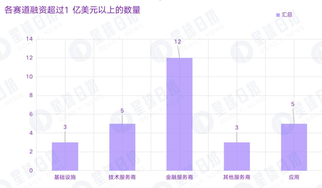 在所有融资事件中,融资规模超过 1 亿美元以上的交易数量达到 28 笔。其中基础设施赛道 3 笔,技术服务商赛道 5 笔,金融服务商赛道 12 笔,其他服务商赛道 3 笔,应用赛道 5 笔。
