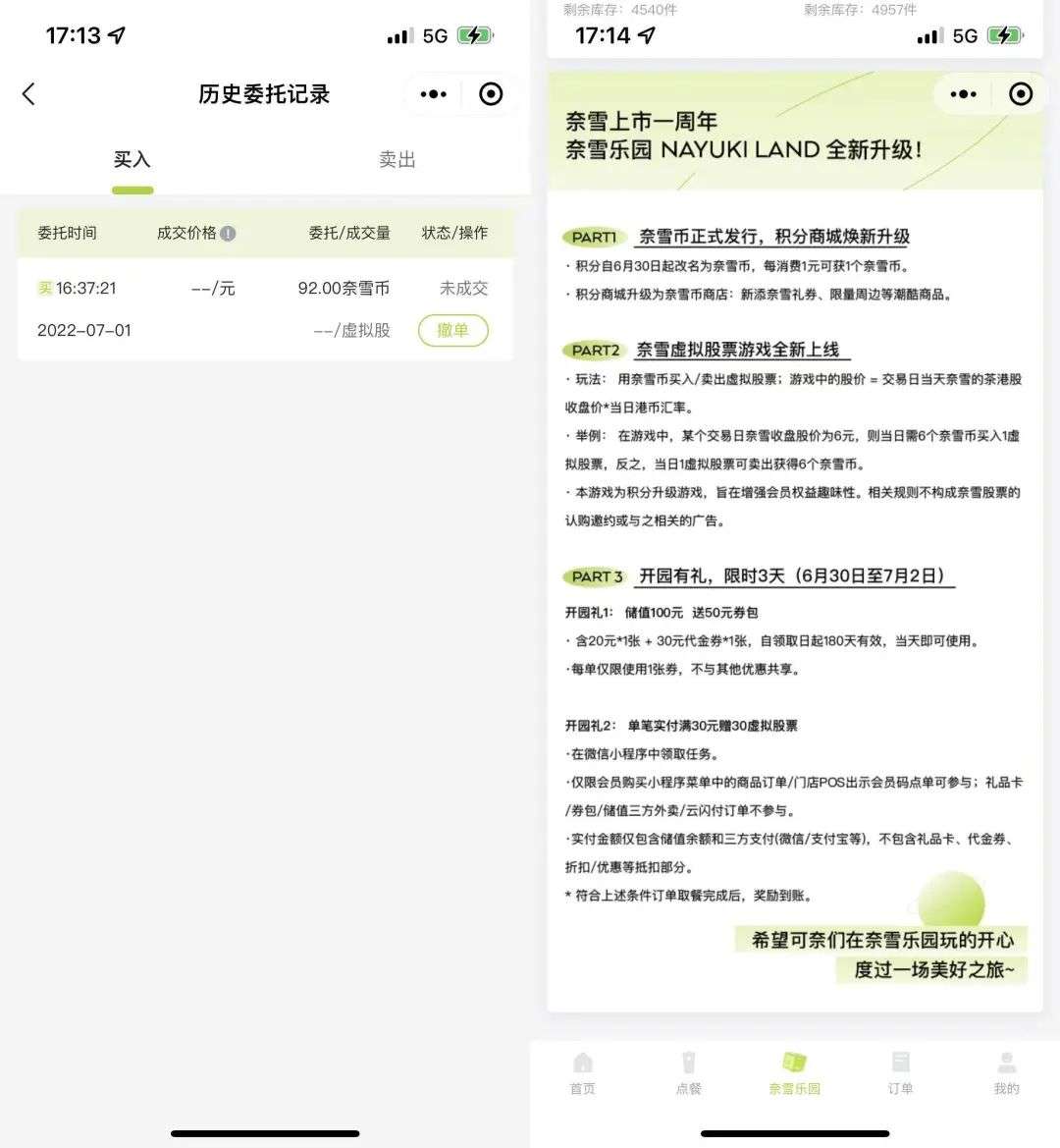 在奈雪的茶上市一周年的这 3 天,用户在小程序点单就可以获得赠送的虚拟股票。点单 30 元就送 30 股,当然股票价格就没办法和现实价格相提并论了,30 股大概能在奈雪商城兑换 3 元代金券,我们也可以认为它的价值差不多就是每股 0.1 元。