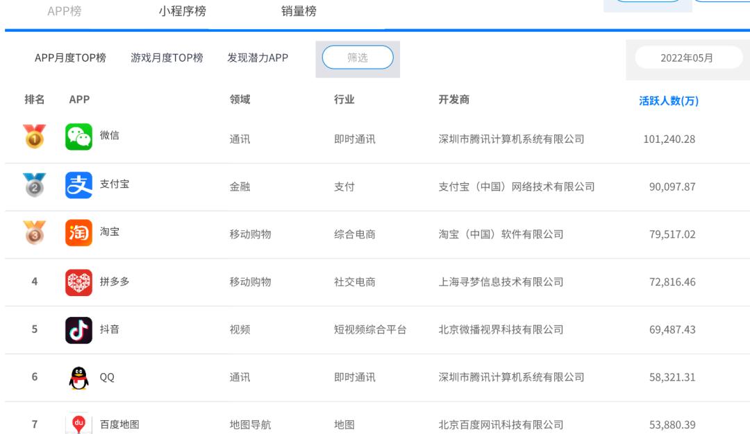 图/2022年5月APP月活跃人数榜单 来源/易观千帆网站截图