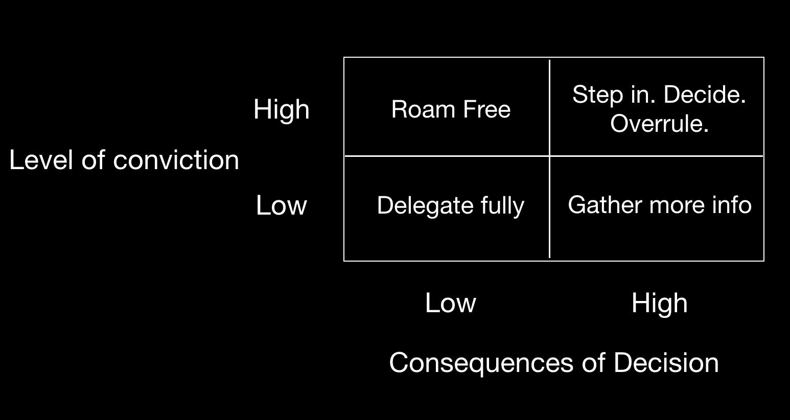 如果两者都很低,那么就把项目完全下放。如果你确信你知道完美的解决方案,但你的下属不同意,那么只要后果不严重,最好让他们去自己做。你应该让他们去实现自己的想法,自己学习判断。另一方面,如果一个决定的后果很严重,你需要有高度的信念,推翻你的队友的判断,或者你需要让他们去收集更多信息,直到你对一个决定有很高的信念。但你不能等到 100% 的信念,否则会行动太慢,理想的水平是 70% 左右。